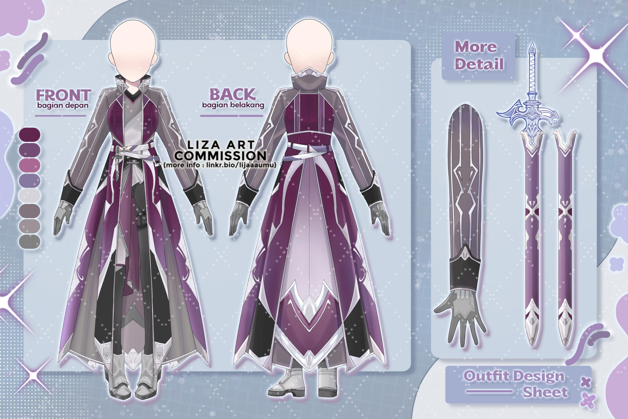 | CHR/Outfit Design sheet (A) | Front (FB) + Color Pallete + Add detail max.3 | 350k | 105 USD |
